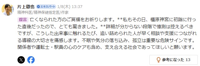 詳細が分からない段階で憶測は控えるべきですが、こうした出来事に触れるたび、追い詰められた人が早く相談や支援につながれる導線の大切さを痛感します。