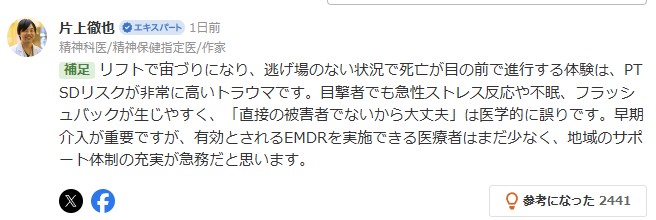 リフトで宙づりになり、逃げ場のない状況で死亡が目の前で進行する体験は、PTSDリスクが非常に高いトラウマです。