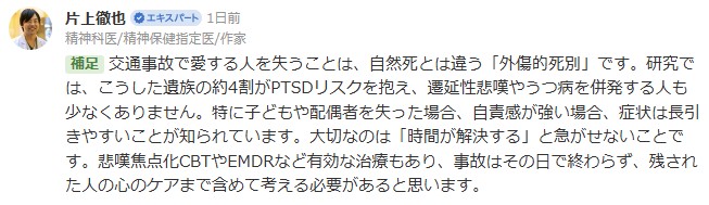 悲嘆焦点化CBTやEMDRなど有効な治療もあり、事故はその日で終わらず、残された人の心のケアまで含めて考える必要があると思います。